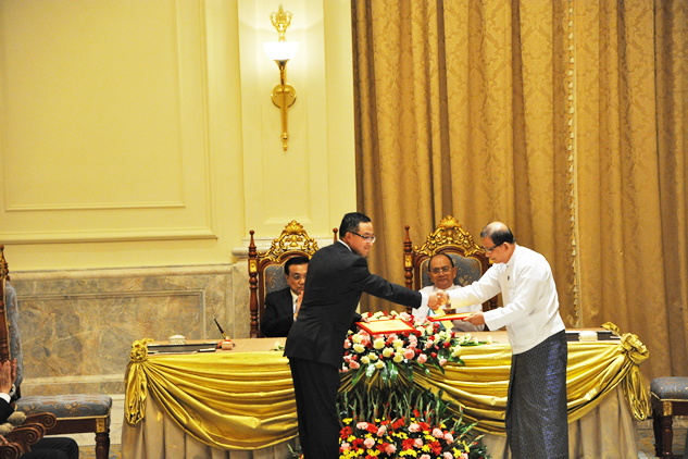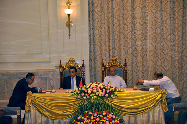 在中緬雙方領(lǐng)導(dǎo)人的見證下,管總與緬方代表在協(xié)議上簽字。