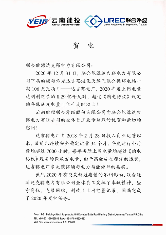 2020年12月31日,聯(lián)合能源達(dá)克鞳電力有限公司下屬的緬甸仰光達(dá)克鞳液化天然氣聯(lián)合循環(huán)電站一期106MW項(xiàng)目(以下簡(jiǎn)稱“達(dá)克鞳電廠”) 2020年度上網(wǎng)電量達(dá)到創(chuàng)紀(jì)錄的8.29億度電,超過(guò)《購(gòu)電協(xié)議(PPA)》規(guī)定的年保底發(fā)電量1億度以上!