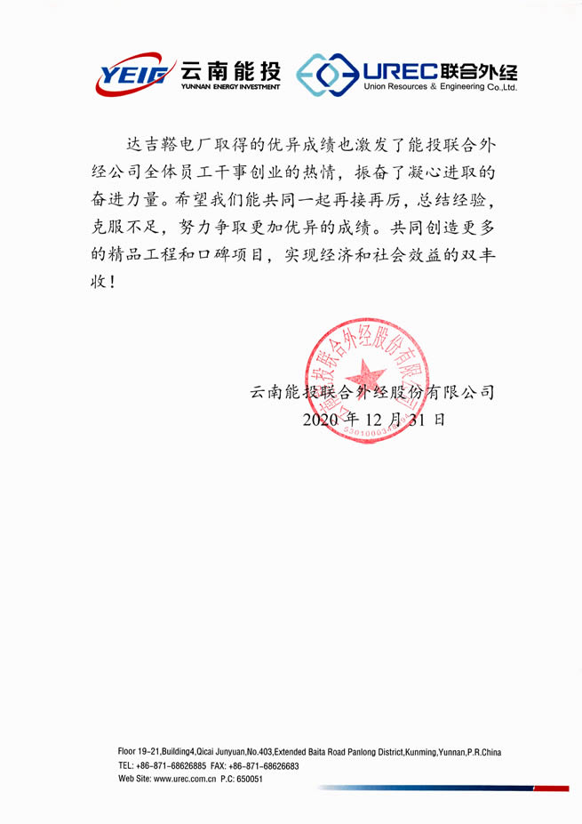 盡管今年有突發(fā)新冠疫情的不利影響,聯(lián)合能源達(dá)克鞳電力有限公司全體員工發(fā)揮了奉獻(xiàn)精神,堅(jiān)守崗位,克服困難,創(chuàng)造了上網(wǎng)電量記錄,圓滿完成了2020年發(fā)電任務(wù)。能投聯(lián)合外經(jīng)總經(jīng)理馮柯向達(dá)克鞳項(xiàng)目公司表達(dá)了祝賀,并勉勵(lì)聯(lián)合外經(jīng)所有同仁2021年再創(chuàng)佳績(jī)!