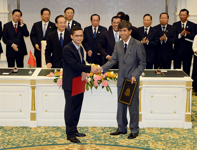 Exchanging the contract copies between Mr. Chen (left), President of Bank of China, Phnom Penh Branch and Mr. Lim Rose (right), Chairman of the Board of CCC